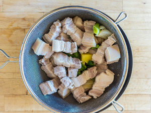 – On commence par couper la poitrine de porc en dés, avant de la faire mijoter deux minutes dans une casserole d’eau bouillante.