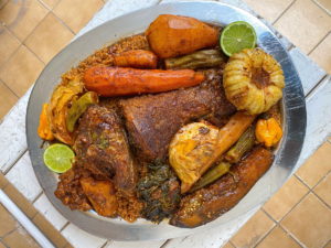 Le Tiebou Dienne est aussi en provenance du Sénégal, mais cette fois à base de poisson. Il s’agit d’un plat de poisson farci avec un mélange de persil, d’ail, de chili et de laurier. Ce qui lui donne un goût vraiment particulier, c’est la pâte de tamarin qu’on lui associe. On cuisine le Tiebou Dienne avec de l’aubergine, du chou blanc, de la carotte et on l’accompagne de riz blanc.